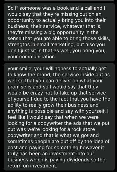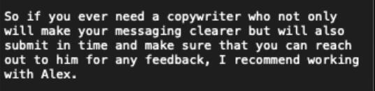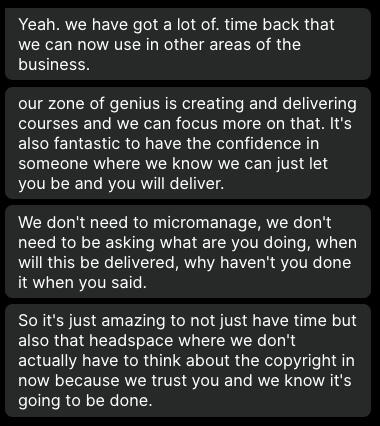 And that’s how companies lift off.Since then, I’ve written for global orgs, accredited trainers, and 7-figure personal brands.And I’ve continued investing in myself to stay close to the best players and mentors in the game.I work closely with founders to launch info products with clear messaging. We tell personality-driven stories that move their audience and sell with purpose.Let's win together.